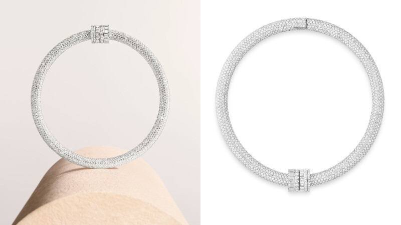 系列核心作品——白金全钻颈鍊,以细腻粒镶钻石铺陈整体,将品牌标誌图腾重构于中央,以不同切割形状展现细节层次:矩形钻石象徵罗缎直线刻纹、公主方形呈现巴黎饰纹、圆形钻石织出双圈同心圆,而纯粹的钻石圈则作为永恆象徵,贯穿整体设计语言。