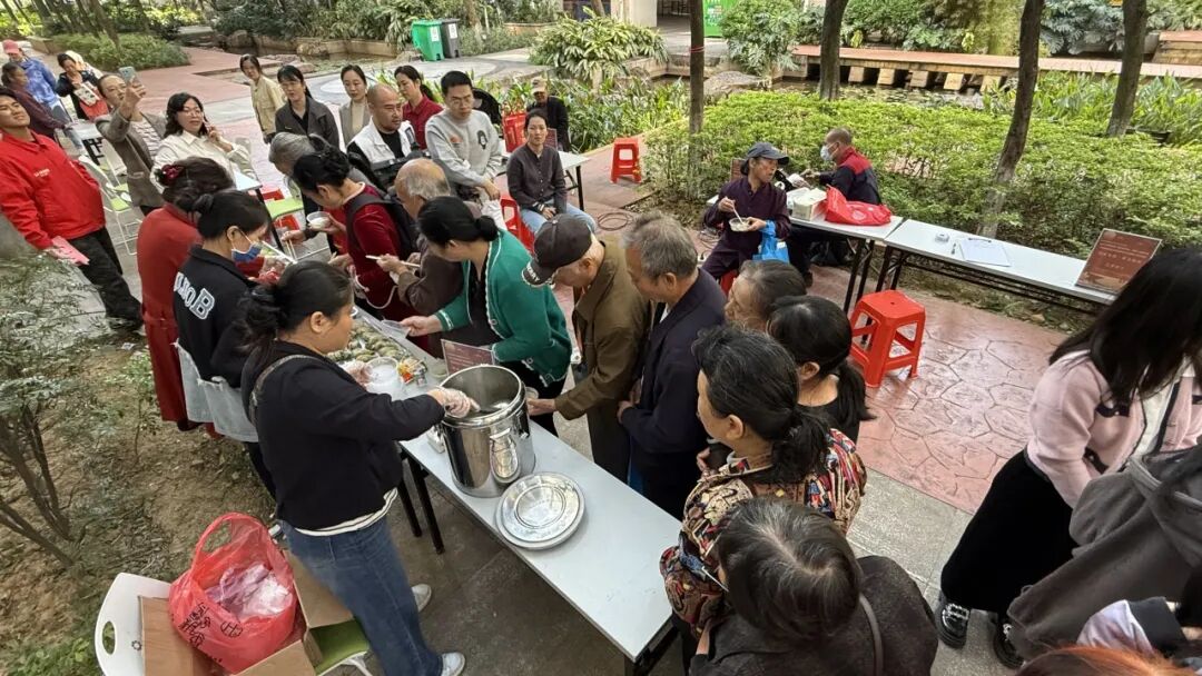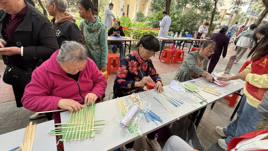 随后,“老友集市”热闹开启,成为活动亮点。特色体验区里,老人亲手制作手工竹编扇,感受传统手工艺韵味,还能品尝辖区商家提供的“老火汤”与特色美食,拉近邻里距离;普法知识有奖问答点,通过互动普及法律常识,答对者获小礼品;便民服务摊位更显贴心,志愿者免费为老人理发,社区医生提供血压测量、中医诊脉与健康咨询,小区物业志愿者则免费磨刀,切实解决居民需求。