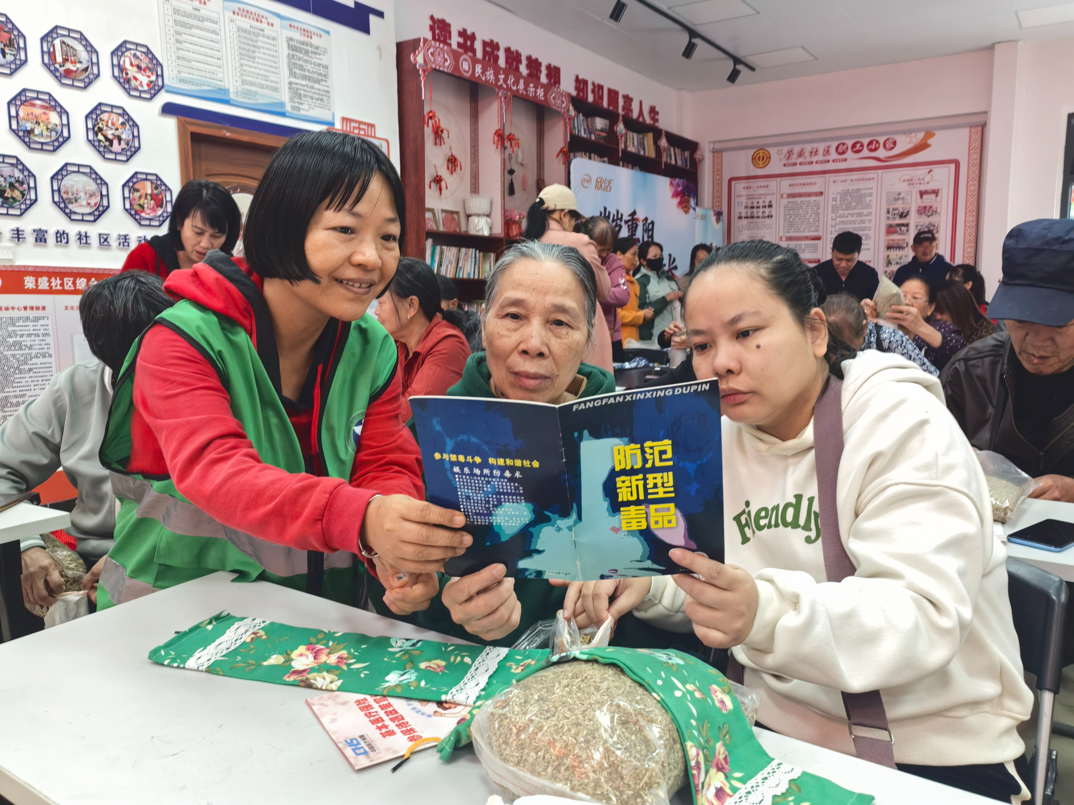 在制作艾枕的温馨氛围中,禁毒宣传也以更贴近生活的方式自然展开。社区禁毒志愿者向辖区老人发放禁毒宣传册,结合真实案例,生动讲解新型毒品的伪装形式及防范要点。